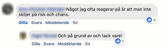 Netan och flera andra tar upp den intressanta skillnaden mellan ”på grund av” och ”tack vare” samt skillnaden mellan ”risken är” och ”chansen är”. ”Tack vare” och ”chansen är” uttrycker något positivt. Känn själv hur galet det låter att till exempel säga ”tack vare sin sjukdom blev han allt svagare”.